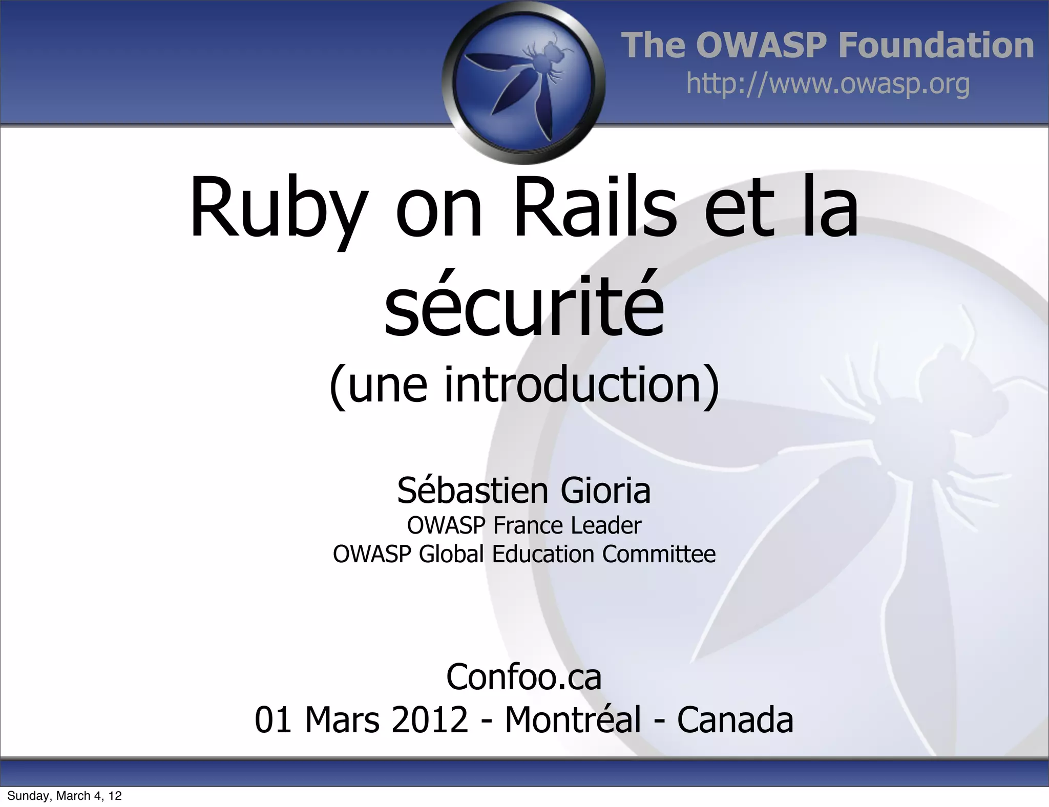 Le document présente des problèmes de sécurité associés à Ruby on Rails, notamment des vulnérabilités comme l'injection SQL, le Cross-Site Scripting (XSS) et des lacunes dans la gestion des sessions. Il souligne l'importance de la validation des données, de l'utilisation de requêtes paramétrées et de pratiques de sécurité adéquates pour atténuer ces risques. L'auteur, Sébastien Gioria, partage également son expertise et son expérience dans la sécurité des systèmes d'information.