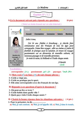 Le document contient une série d'exemples d'examens pour les élèves de première année de l'école secondaire, incluant des questions de compréhension, de vocabulaire, et de grammaire. Les étudiants doivent répondre à divers types de questions basées sur des documents fournis, illustrant des situations de la vie quotidienne. Chaque section attribue un certain nombre de points, et les résultats sont destinés à évaluer les compétences en langue française des élèves.