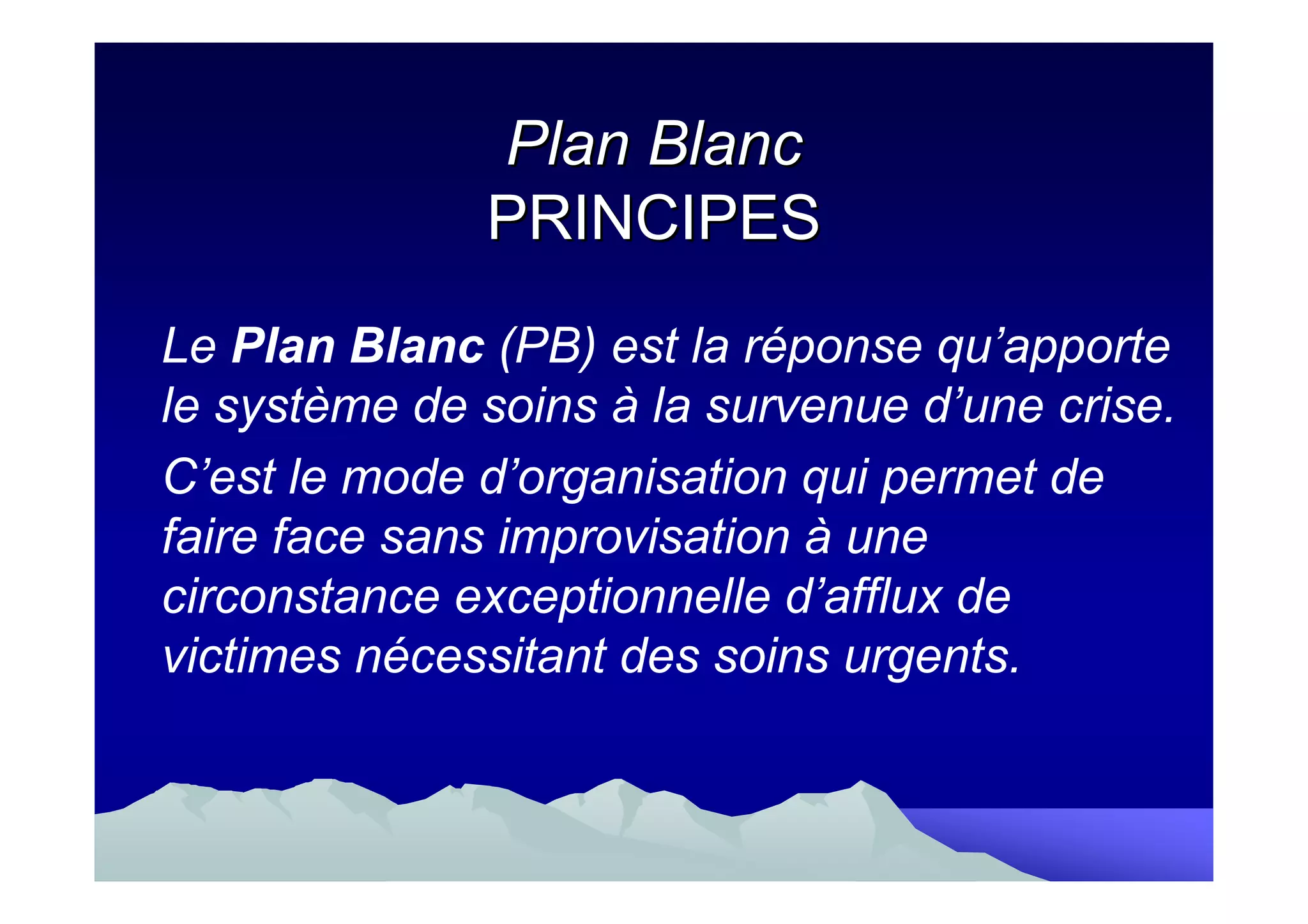 Le plan blanc est un dispositif d'urgence permettant aux établissements de santé de gérer une crise, caractérisé par une réponse organisée aux afflux massifs de victimes nécessitant des soins urgents. Il repose sur sept grands principes, notamment l'établissement d'une cellule de crise et l'organisation des services de soins, et est déclenché par le directeur de l'établissement en concertation avec le service d'urgence selon des critères précis. La gestion du plan inclut également la communication avec les autorités et le public, ainsi que la coordination des moyens médicaux et logistiques nécessaires à la prise en charge des patients.