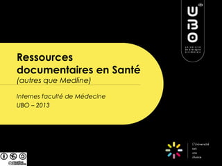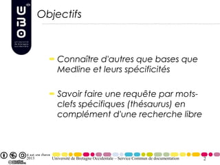 Ce document présente des ressources documentaires en santé au sein de l'université de Bretagne Occidentale, en soulignant des bases de données autres que Medline. Il explique comment effectuer des recherches par mots-clés et accéder à des articles en texte intégral, tout en fournissant des exemples d'exercices pratiques. Les différentes bases de données, leur utilisation, ainsi que les services disponibles, sont également détaillés.