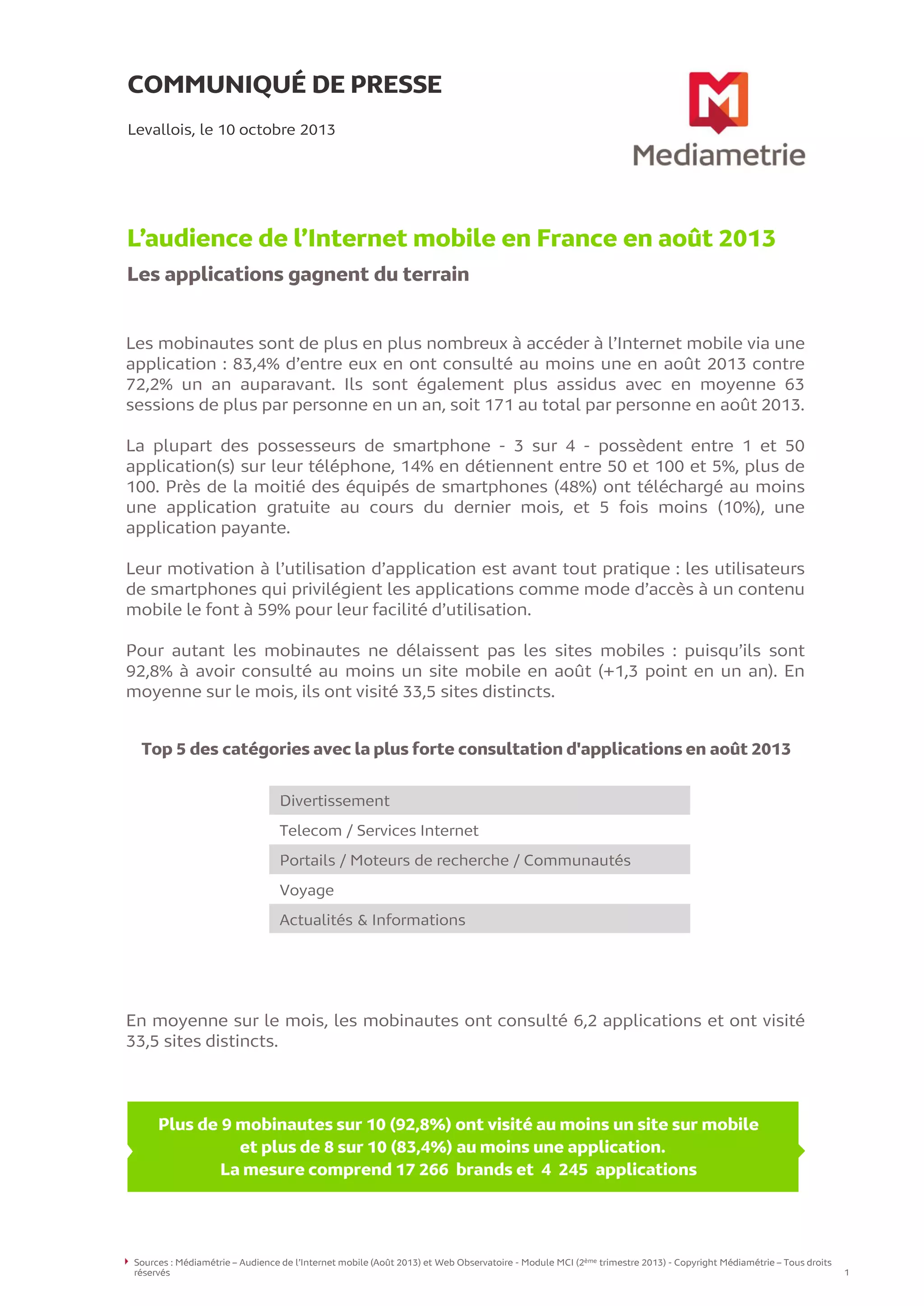 En août 2013, 92,8% des mobinautes en France ont visité au moins un site mobile, et 83,4% ont utilisé des applications, montrant une augmentation notable par rapport à l'année précédente. Les utilisateurs ont en moyenne consulté 33,5 sites distincts et 6,2 applications par mois, avec une préférence pour les applications pour leur facilité d'utilisation. Les principaux acteurs de l'audience incluent Google, Facebook et YouTube, avec un intérêt croissant pour les contenus mobiles.