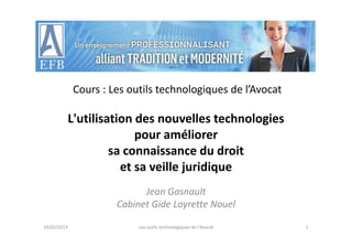 Le document présente des outils et techniques technologiques pour les avocats afin d'améliorer leur recherche juridique et leur veille. Il couvre des sujets tels que l'utilisation d'Internet, la préparation et l'organisation des recherches, ainsi que l'accessibilité des fonds juridiques disponibles en ligne. Les avocats sont encouragés à tirer parti des ressources numériques et des enseignements offerts pour optimiser leur pratique professionnelle.