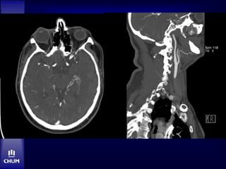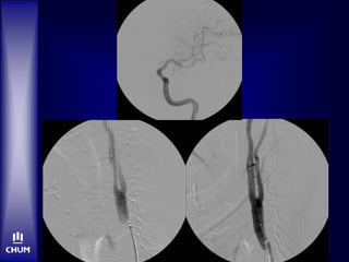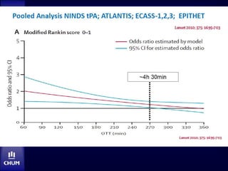 Le document aborde le traitement de l'accident vasculaire cérébral (AVC) aigu, mettant en avant l'importance de la thrombolyse intraveineuse (IV) et des traitements endovasculaires. Il présente des études démontrant l'efficacité des traitements, les avantages et inconvénients des approches, ainsi que des algorithmes décisionnels pour le choix du traitement basé sur l'âge du patient et la gravité des symptômes. Les résultats montrent que la recanalisation rapide est essentielle pour un meilleur pronostic des patients victimes d'AVC.