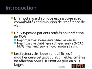 Le document détaille la création et la gestion des fistules artério-veineuses (fav) pour l'hémodialyse, en soulignant l'importance de la sélection du site et des facteurs de risque associés à la thrombose. Des recommandations basées sur des études et des pratiques cliniques sont fournies pour optimiser la perméabilité fonctionnelle et la survie des accès vasculaires. Les résultats montrent que des approches agressives de suivi et d'intervention peuvent améliorer les taux de survie des fav malgré les défis posés par des comorbidités telles que le diabète.