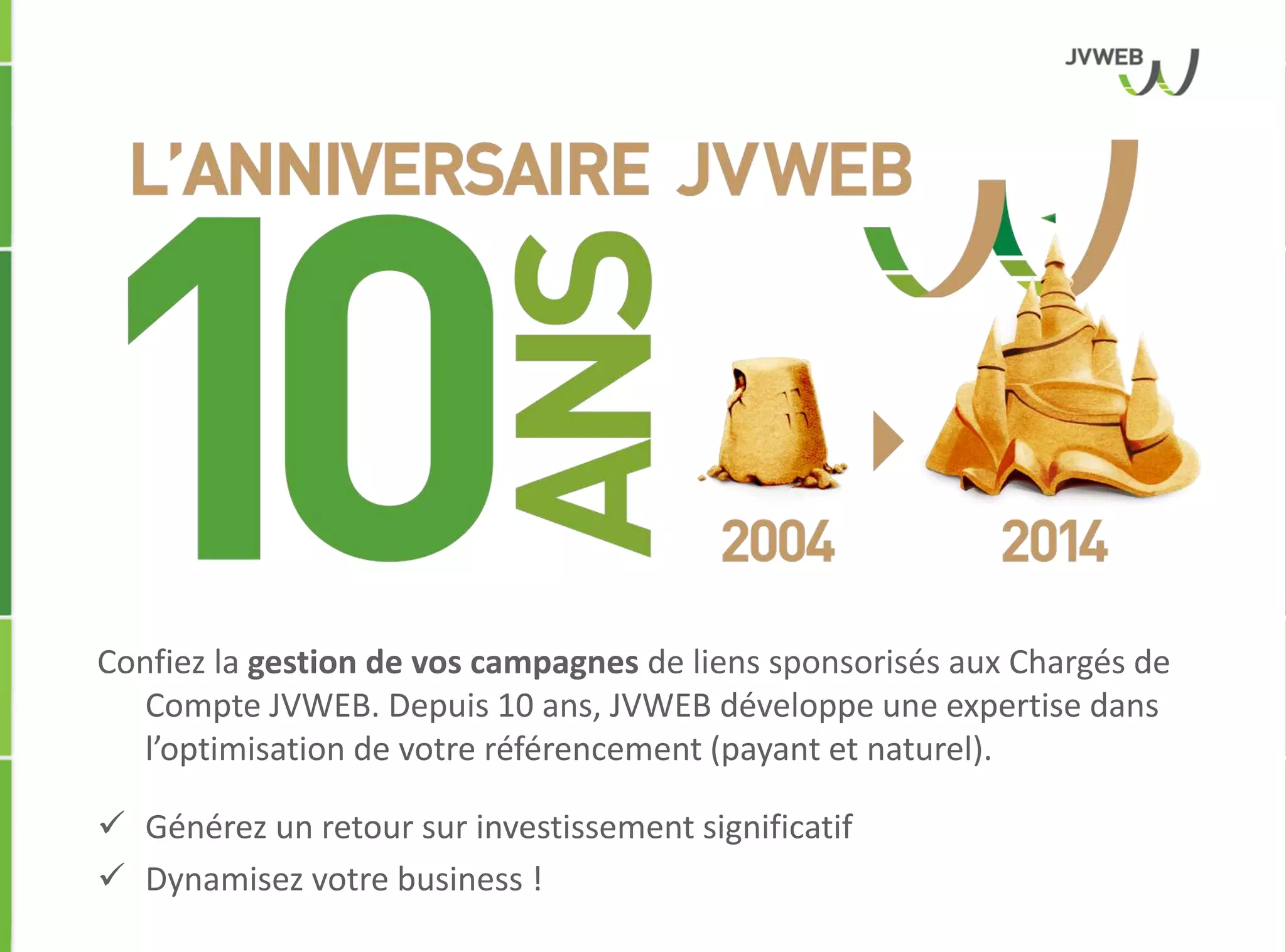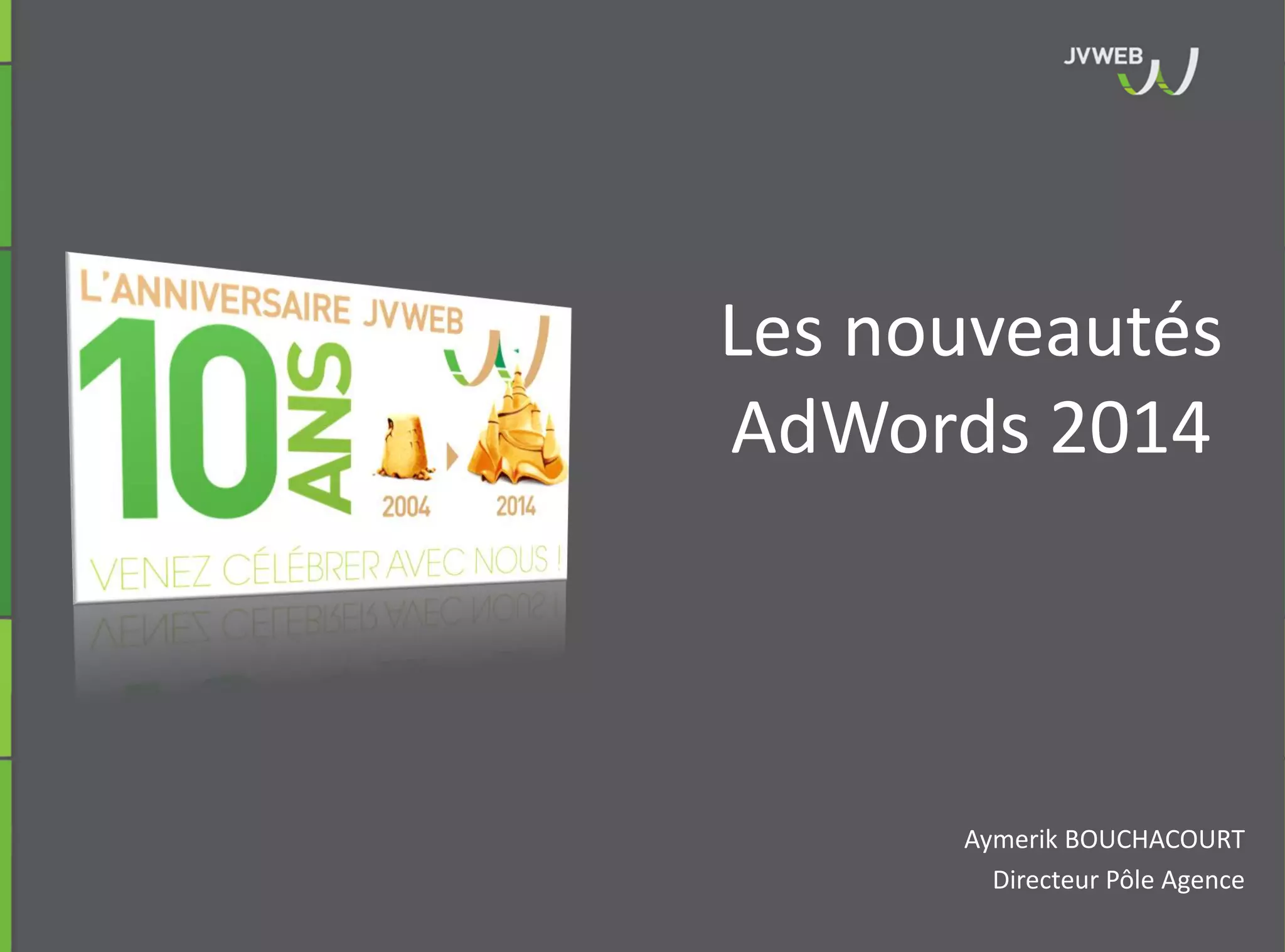Le document présente les nouveautés d'Adwords en 2014, en se concentrant sur l'optimisation des campagnes de liens sponsorisés par jvweb. Il aborde des outils tels que Gmail Sponsored Promotion, les extensions d'annonces et des scripts pour gérer les campagnes, tout en soulignant les avantages de ces innovations pour accroître la rentabilité. Enfin, il évoque l'importance d'un ciblage précis et des retours d'expérience pour maximiser l'efficacité des campagnes publicitaires.