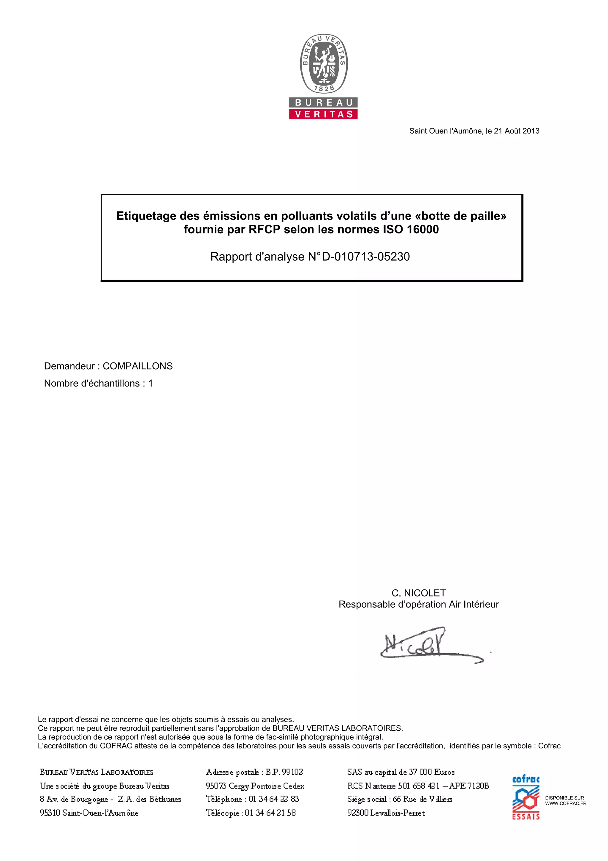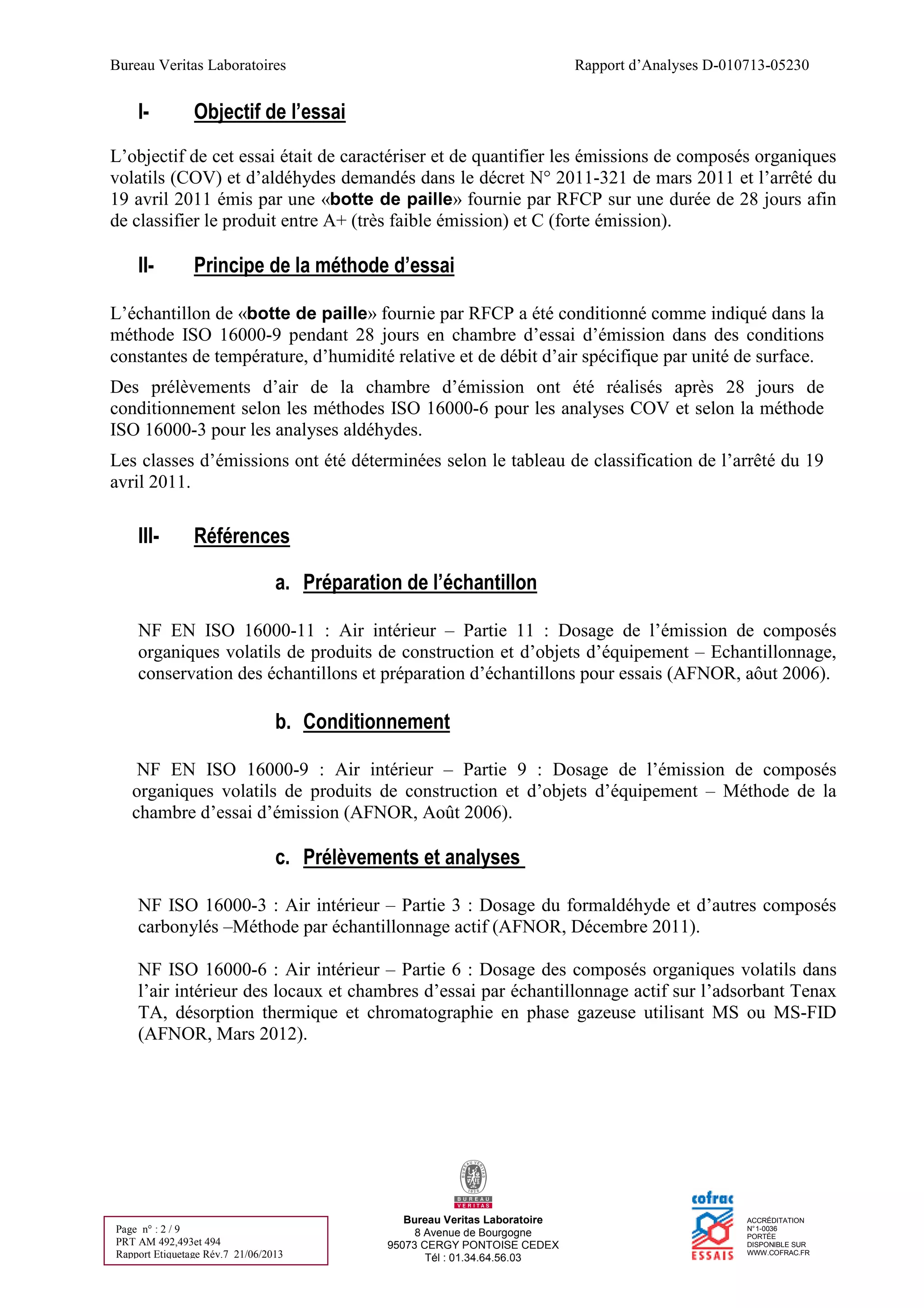 Le rapport d'analyse n°d-010713-05230 effectué par Bureau Veritas détaille les essais sur les émissions de composés organiques volatils (COV) d'une 'botte de paille' fournie par RFCP, conformément aux normes ISO 16000. Il présente les résultats des concentrations en COV et en aldéhydes, ainsi que leur classification selon le décret n° 2011-321. Les résultats montrent que les concentrations mesurées sont inférieures aux valeurs limites, justifiant un étiquetage des émissions dans la catégorie A+/A.