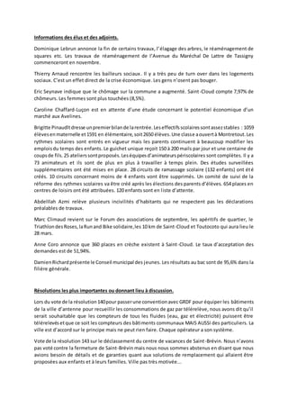 Le conseil municipal du 29 septembre 2014 a été marqué par des interventions concernant le report de la séance et des tensions au sein de la liste Saint-Cloud c'est vous. Le maire a présenté des décisions récentes et discuté de la métropole du Grand Paris, tandis que des élus ont exprimé des préoccupations sur la diminution des subventions aux associations. Des questions sur la mise en œuvre des rythmes scolaires et des conflits au sein d'associations locales ont également été soulevées.