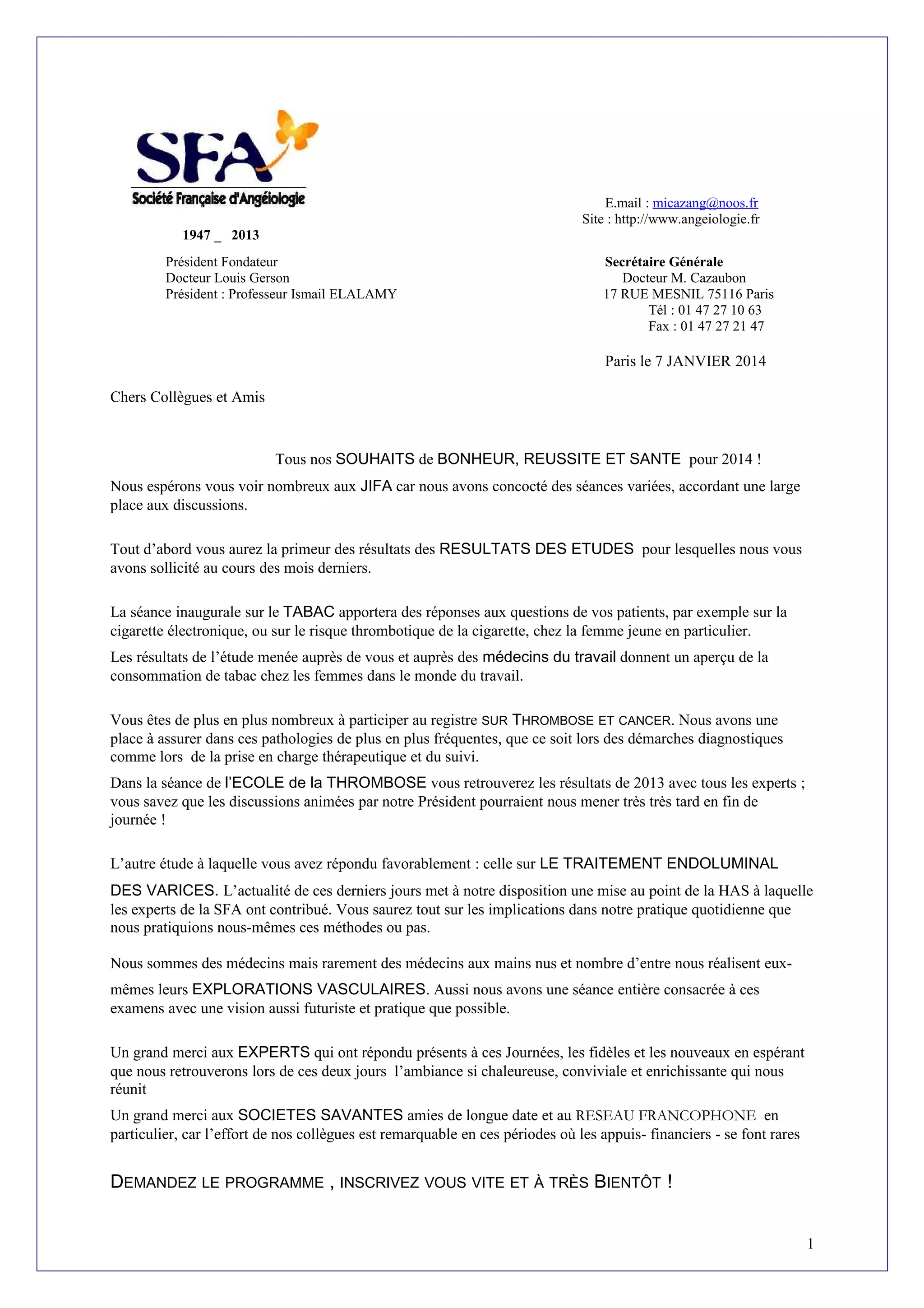 Le document est une lettre de Michèle Cazaubon adressée aux collègues pour les inviter aux JIFA 2014, soulignant l'importance des discussions sur divers thèmes tels que le tabac et la thrombose. Il annonce les résultats d'études sollicitées auprès des médecins et la tenue de séances dédiées à des innovations en matière de traitement. L'auteur remercie les experts et les sociétés savantes pour leur soutien dans l'organisation de cet événement.