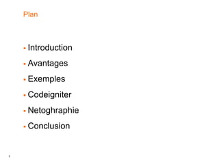 Le document présente le framework PHP CodeIgniter, qui facilite la création de sites web en offrant un ensemble de bibliothèques et une structure MVC. Il évoque les avantages d'utiliser un framework, tels que la productivité accrue, la lisibilité du code et la réutilisation des composants, ainsi que des exemples de frameworks similaires. Enfin, il souligne que CodeIgniter est facile à apprendre et assure une sécurité accrue pour les applications web.
