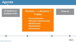 Le document présente cinq idées pour transformer le contenu en business digital, mettant l'accent sur la personnalisation, l'efficacité rédactionnelle, le multichannel, la monétisation et la performance. EZ Systems, fondé en 1999, est un leader dans la gestion de contenu open source avec une expérience reconnue auprès de clients internationaux. Il propose des solutions pour aider les entreprises à réussir leur transition numérique en optimisant leur contenu.