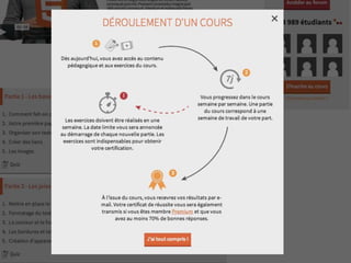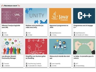 OpenClassrooms propose une plateforme de cours en ligne avec une large gamme de sujets allant du développement web à la finance, comptant 2,5 millions d'utilisateurs mensuels. Le modèle d'abonnement premium permet un suivi individualisé des apprenants et des formations adaptées aux entreprises. La monétisation repose sur les abonnements et la vente de ressources, tout en partageant les revenus avec les auteurs de MOOCs.