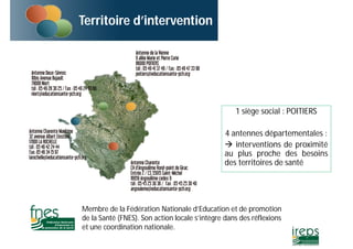 Le document présente les missions et activités de l'IREPS, qui vise à promouvoir l'éducation et la santé publique par le biais d'interventions de proximité et d'accompagnement des acteurs locaux. Il détaille les formations, l'accompagnement méthodologique en évaluation de programmes, et le soutien technique de l'ARS Poitou-Charentes. Une action de recensement des outils pédagogiques est également prévue pour valoriser les ressources existantes dans les programmes d'éducation thérapeutique des patients.