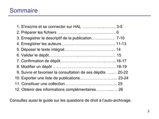 Le guide du déposant HAL UBO fournit des instructions pour l'inscription, le dépôt et la diffusion de publications scientifiques à l'Université de Bretagne Occidentale. Il aborde divers aspects tels que la préparation des fichiers, l'enregistrement des auteurs, la validation du dépôt, ainsi que les statistiques de consultation des documents. Les utilisateurs peuvent également créer des collections et obtenir des informations supplémentaires en contactant le support du CCSD.