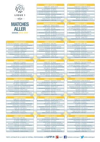 Le document présente un calendrier des matchs de football de diverses équipes en Ligue 1, incluant des clubs comme Paris Saint-Germain, Olympique de Marseille, et AS Monaco. Les dates des matchs sont spécifiées, avec un focus sur les confrontations entre les équipes tout au long de la saison. Les informations incluent des détails sur les clubs participants et des rappels de l'actualité de la ligue.