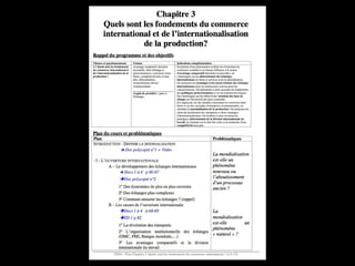 Le document aborde les fondements du commerce international et de l'internationalisation de la production, ainsi que leurs impacts économique et environnementaux. Il analyse les concepts de spécialisation, d'avantage comparatif et de décomposition internationale des processus productifs dans un contexte de mondialisation croissante. Le texte met également en lumière les enjeux de la compétitivité et les stratégies d'internationalisation des entreprises.