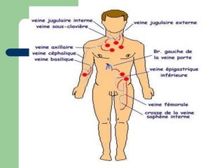 Le document traite de l'utilisation des voies veineuses centrales dans le cadre d'une formation infirmière, y compris la préparation, la mise en place, le suivi et l'ablation des cathéters veineux centraux. Il met l'accent sur l'importance de l'hygiène et des protocoles d'asepsie durant les manipulations pour éviter les infections. Des détails spécifiques concernant les différents types de cathéters, les techniques de pose et les soins associés sont également fournis.