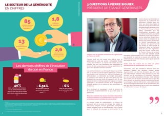 Le document présente une analyse du secteur de la générosité en France en 2018, soulignant une baisse significative des dons due à des changements fiscaux et à des mesures telles que la hausse de la CSG pour les retraités. Il met l'accent sur l'importance de la campagne 'donner fait du bien' pour sensibiliser et encourager les dons, particulièrement chez les jeunes donateurs, tout en s'adaptant aux nouvelles formes de dons, comme le crowdfunding. Les résultats indiquent également que 44% des Français font des dons au moins une fois par an, mais le secteur fait face à de nombreux défis pour recruter de nouveaux donateurs.