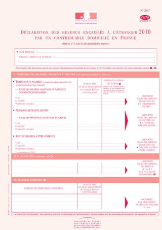 Le document est un formulaire pour la déclaration des revenus encaissés à l'étranger par un contribuable domicilié en France, spécifiant les types de revenus à déclarer et les instructions pour le remplissage. Il couvre des catégories telles que les traitements, salaires, pensions, rentes, plus-values, revenus fonciers et revenus des valeurs mobilières. Des précisions sont fournies sur le crédit d'impôt et les particularités liées aux conventions fiscales.