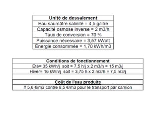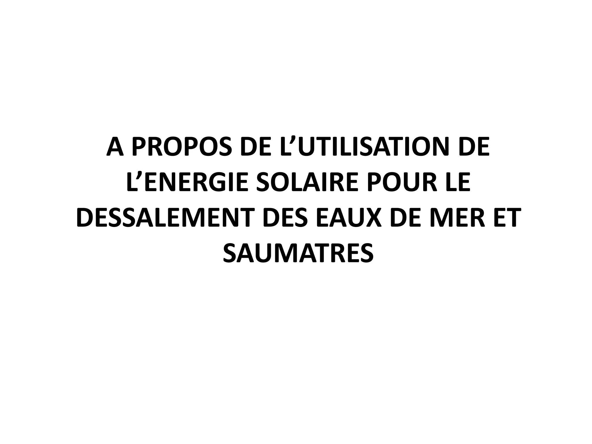 Le document traite de l'utilisation de l'énergie solaire pour le dessalement des eaux de mer et saumâtres, en expliquant les techniques actuelles et les acteurs du marché. Il présente divers procédés de dessalement, notamment la distillation et l'osmose inverse, ainsi que les types de distillateurs solaires. Enfin, il aborde les coûts associés à ces technologies et leur potentiel dans la production d'eau potable durable.