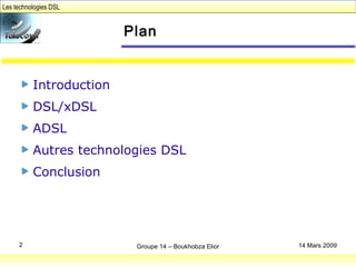 Le document fournit une analyse détaillée des technologies DSL, en expliquant leur définition, leur historique et leur déploiement en France. Il décrit les principes techniques derrière le DSL, y compris le multiplexage de fréquence, la modulation et les différentes variantes comme l'ADSL et le VDSL. La conclusion souligne l'importance du DSL dans le marché français du haut débit par rapport à la fibre optique et aux câbles.