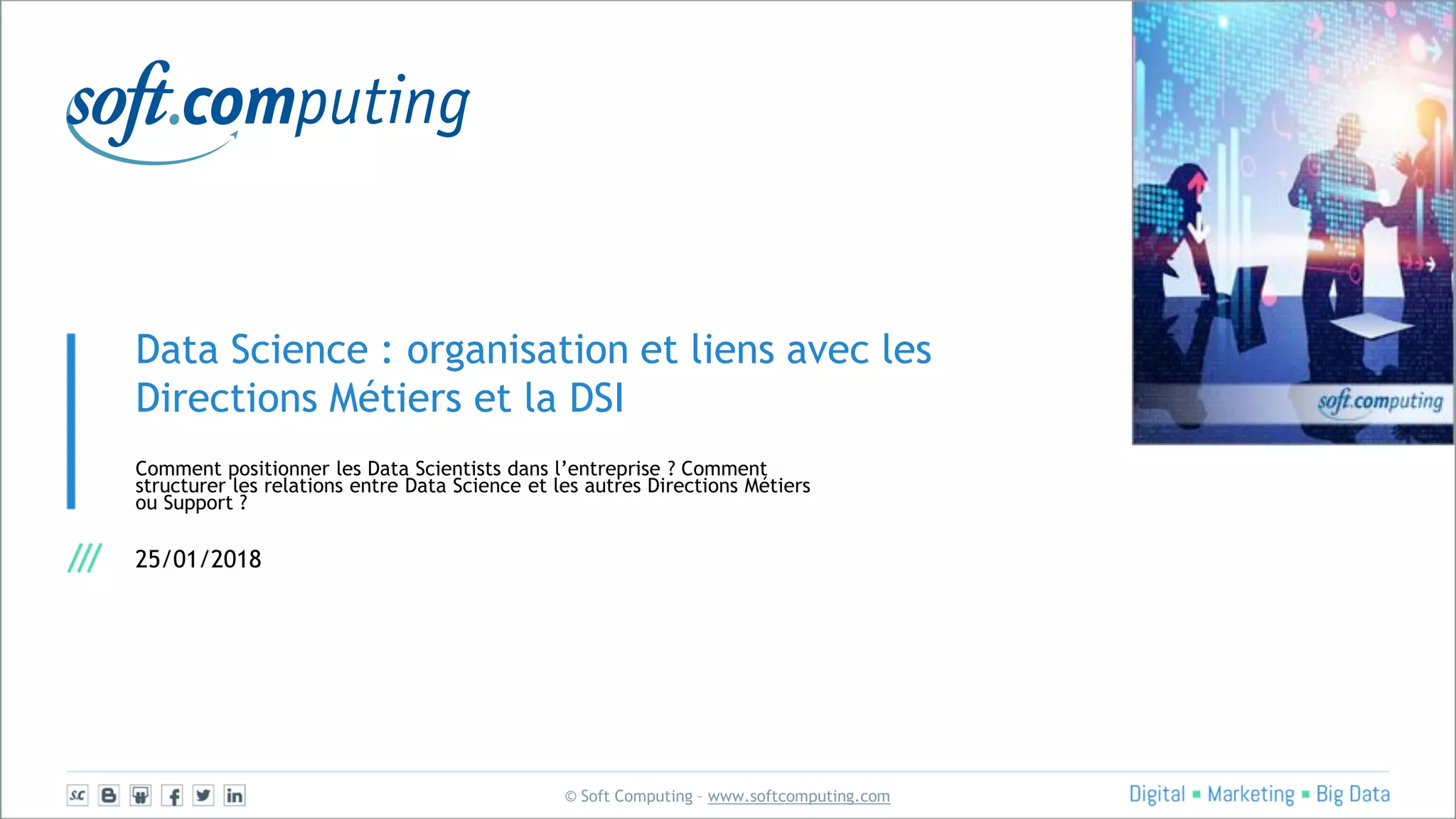 Le document aborde l'organisation des data scientists au sein des entreprises, en soulignant l'importance de structurer les relations entre la data science et les autres directions métiers. Il présente divers modèles d'organisation, des niveaux de maturité, ainsi que les compétences nécessaires pour attirer et fidéliser les talents dans ce domaine. Enfin, il offre un panorama des retours d'expérience et des choix organisationnels effectués par des entreprises clientes.