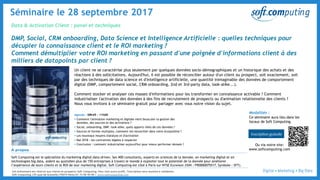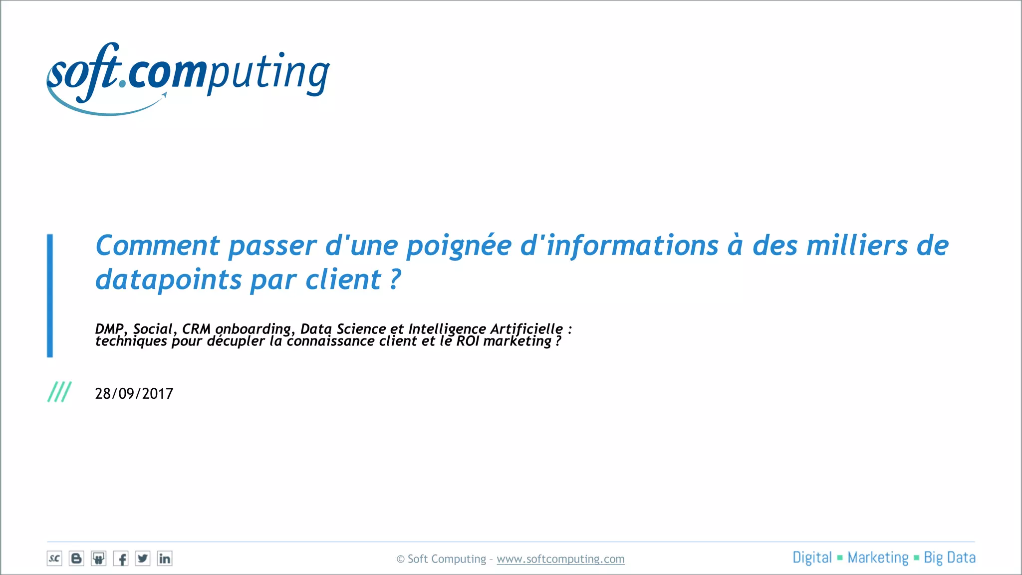 Le document présente un séminaire sur les techniques permettant de transformer un ensemble limité d'informations sur les clients en milliers de datapoints, en utilisant la data science et l'intelligence artificielle pour enrichir la connaissance client et améliorer le retour sur investissement en marketing. Elle aborde des thèmes tels que la collecte et l'analyse de données comportementales, l'activation des données pour le recrutement de prospects et l'engagement client, ainsi que l'importance d'une stratégie de marketing data-driven. Soft Computing, l'organisateur, est un expert en marketing digital et aide de nombreuses entreprises à exploiter le potentiel des données pour optimiser leurs efforts marketing.
