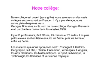 Le collège Georges Brassens est l'un des rares établissements en France à être ouvert sans grille, offrant de nombreux espaces verts. Il compte 51 professeurs, 643 élèves répartis en 25 classes, et enseigne divers sujets, dont l'espagnol, l'histoire-géographie, le français et les sciences. Le collège accueille les élèves de la 6ème à la 3ème.