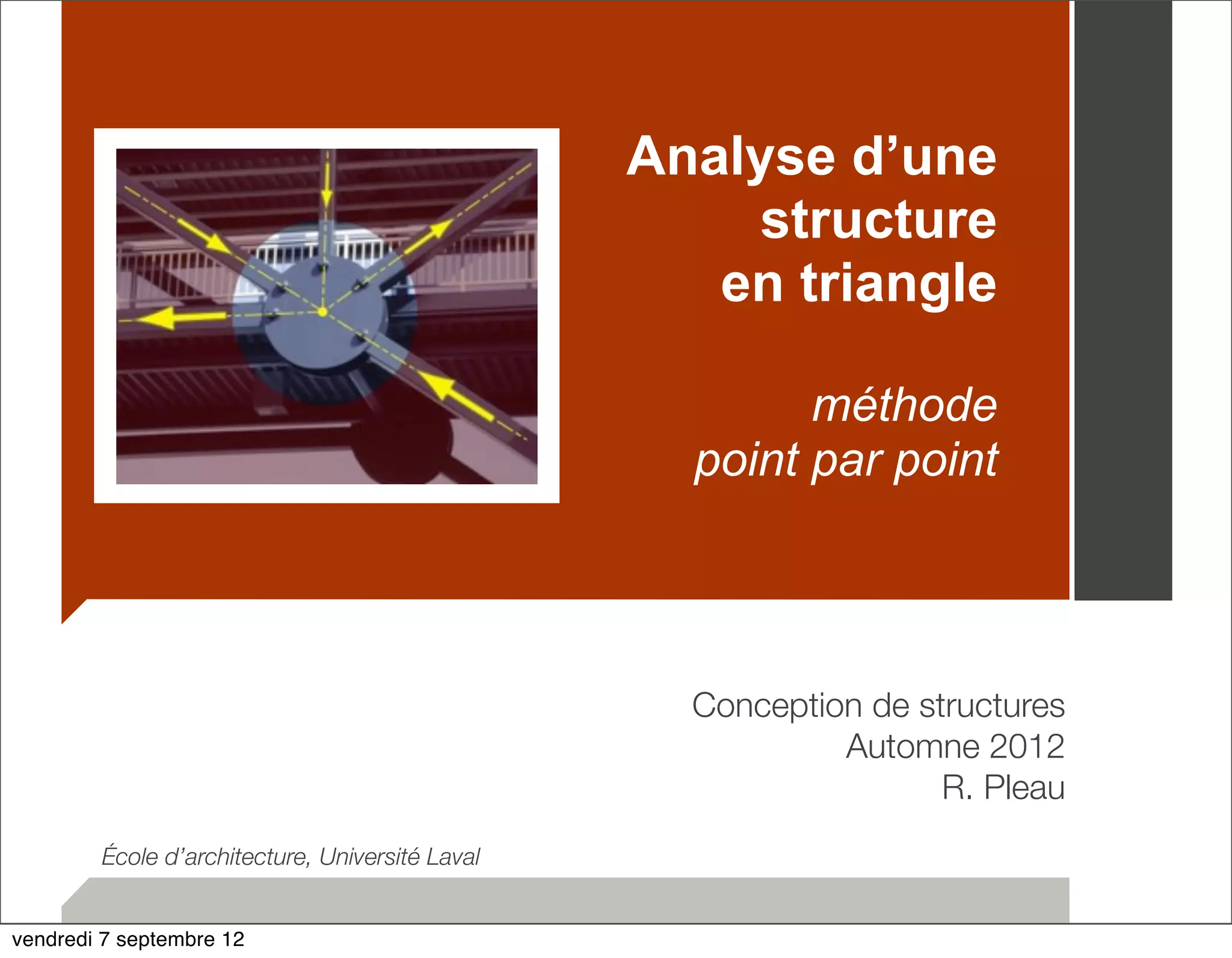 Le document traite de l'analyse d'une structure en treillis en utilisant une méthode étape par étape pour déterminer les efforts axiaux dans les membrures. Il présente le processus de dessin des diagrammes de corps libre, l'identification des forces, et la construction d'un polygone de forces pour garantir l'équilibre statique. Les conclusions sur la nature des efforts (tension ou compression) sont également expliquées.