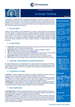 Le document explique que le design thinking est une approche d'innovation centrée sur l'utilisateur, née en réponse à l'évolution du marketing vers l'expérience client. Il décrit les étapes du processus de design thinking : inspiration, idéation et implémentation, ainsi que l'importance de la pluridisciplinarité et du prototypage. Enfin, il mentionne plusieurs formations et ressources en ligne pour intégrer cette méthode dans les entreprises.