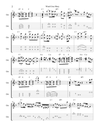 Le document est une transcription de la chanson 'Wind Cries Mary' de Jimi Hendrix pour guitare. Il contient des tablatures et des annotations spécifiques pour jouer le morceau. Les notations incluent des accords, des notes et des indications de rythme.