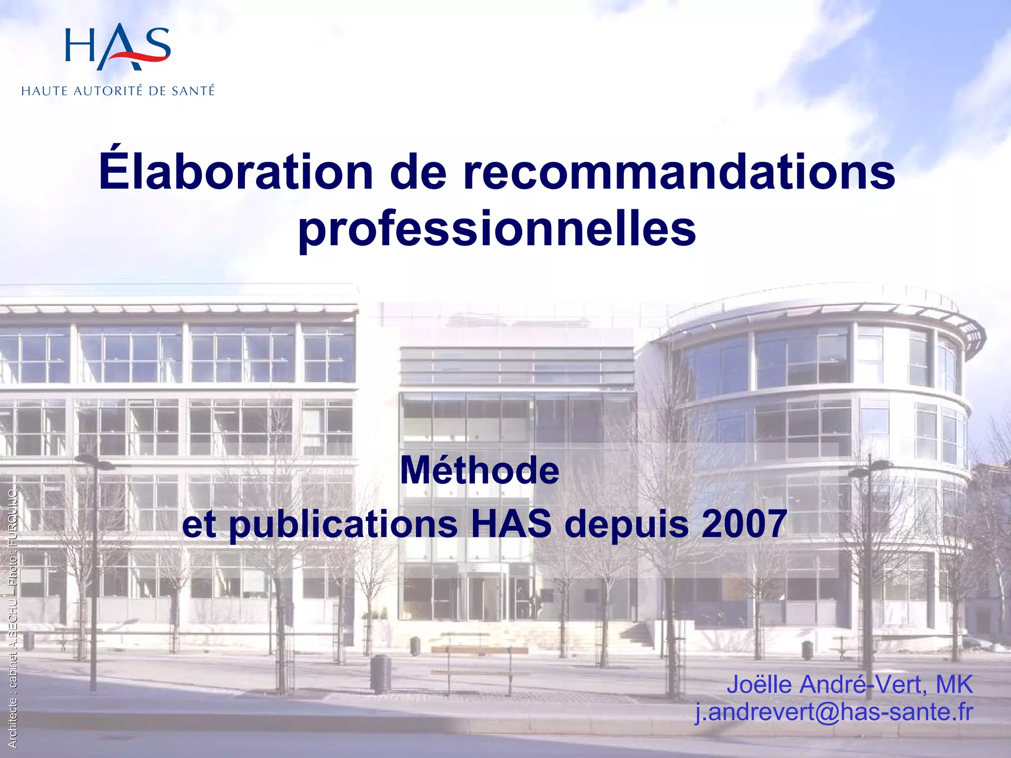 Le document présente les recommandations professionnelles de la Haute Autorité de Santé (HAS) sur l'élaboration et la diffusion des bonnes pratiques en santé pour soutenir les décisions des pouvoirs publics et améliorer la qualité des soins. Il décrit la méthodologie systématique utilisée pour intégrer les avis des professionnels et usagers, influencer les pratiques cliniques, et aborder des thèmes de santé publique tels que la kinésithérapie et la douleur chronique. Des critères de qualité et des études sur l'efficacité des interventions sont également mentionnés, soulignant l'hétérogénéité des pratiques et le besoin d'amélioration continue.