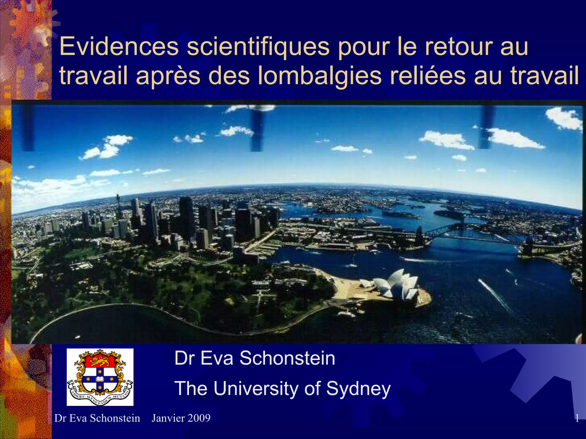 Le document présente des preuves scientifiques sur le retour au travail après des lombalgies liées au travail, soulignant l'importance de l'utilisation de recherches cliniques de haute qualité. Il identifie divers facteurs pronostiques et préventifs qui influencent le retour au travail et la prévention des incapacités, tout en notant que des programmes de reconditionnement physique intégrant des approches cognitives et comportementales peuvent réduire les jours d'absence. Enfin, il aborde l'importance de la transdisciplinarité pour mieux comprendre et traiter ces problématiques.