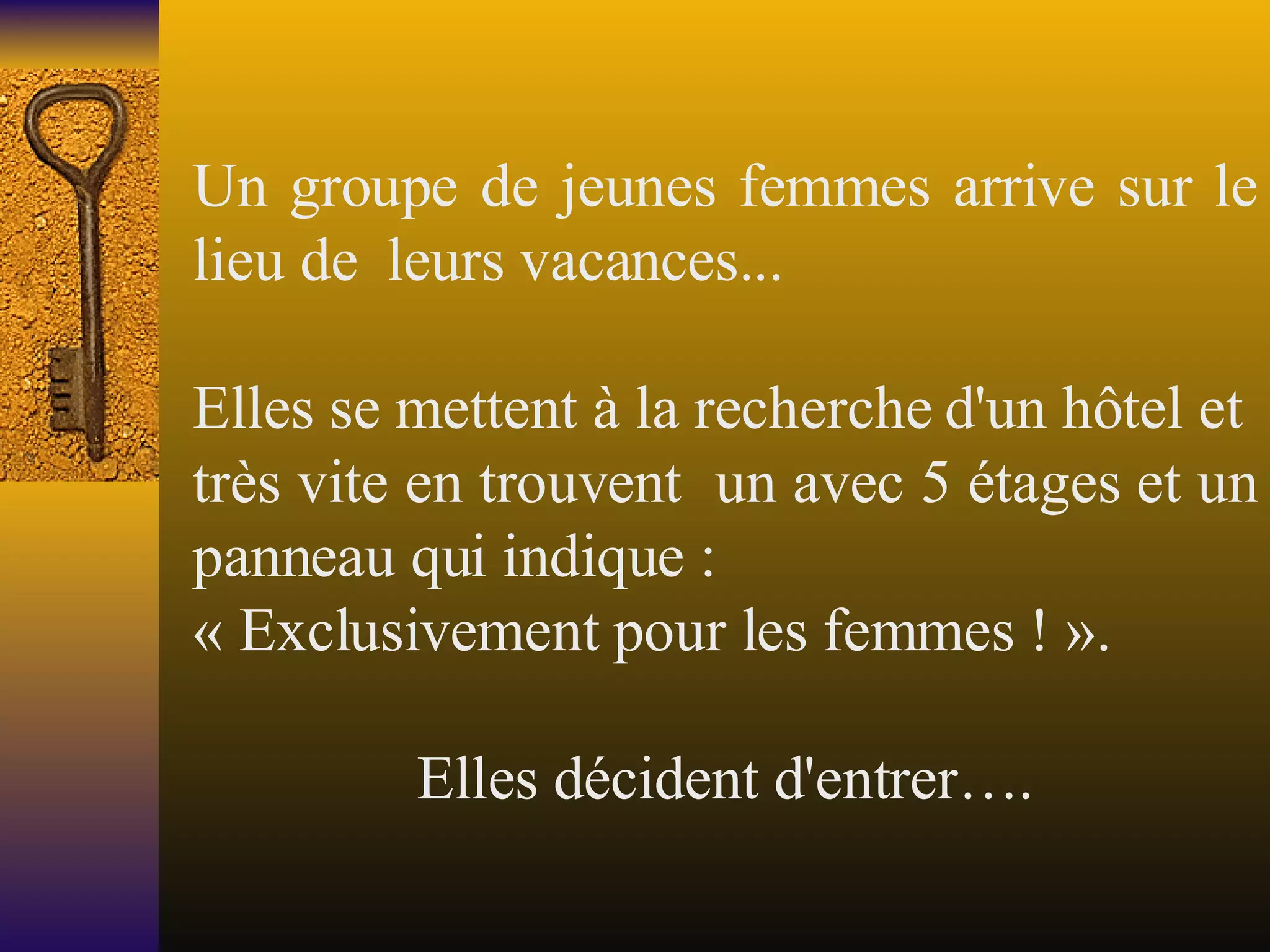 Un groupe de jeunes femmes visite un hôtel exclusivement féminin avec des panneaux humoristiques sur les hommes à chaque étage. Chaque panneau dépeint une vision de plus en plus positive des hommes jusqu'à révéler au dernier étage qu'il n'y a pas d'hommes, soulignant qu'une femme visera toujours plus haut. Le texte se termine par une invitation à partager le message avec ceux susceptibles d'en rire.