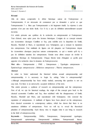 Cet article passe en revue les différentes approches de l'entrepreneuriat et de la création d'entreprises, en mettant en lumière son histoire et son évolution conceptuelle, depuis les économistes classiques jusqu'aux théories contemporaines. Les auteurs soulignent la complexité et l'hétérogénéité du phénomène entrepreneurial, en appelant à une approche interdisciplinaire pour mieux comprendre son impact. L'article questionne également l'absence d'une définition universelle acceptée de l'entrepreneur et de l'entrepreneuriat.