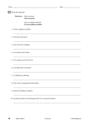 Ce document est un manuel d'exercices destiné à apprendre le vocabulaire, la grammaire et la conjugaison française à travers des activités variées. Il couvre des thèmes artistiques et l'utilisation de verbes associés à l'art, tout en incitant à répondre à des questions par écrit. Les exercices incluent des phrases à compléter, des questions sur des œuvres d'art et des opposés d'adjectifs.