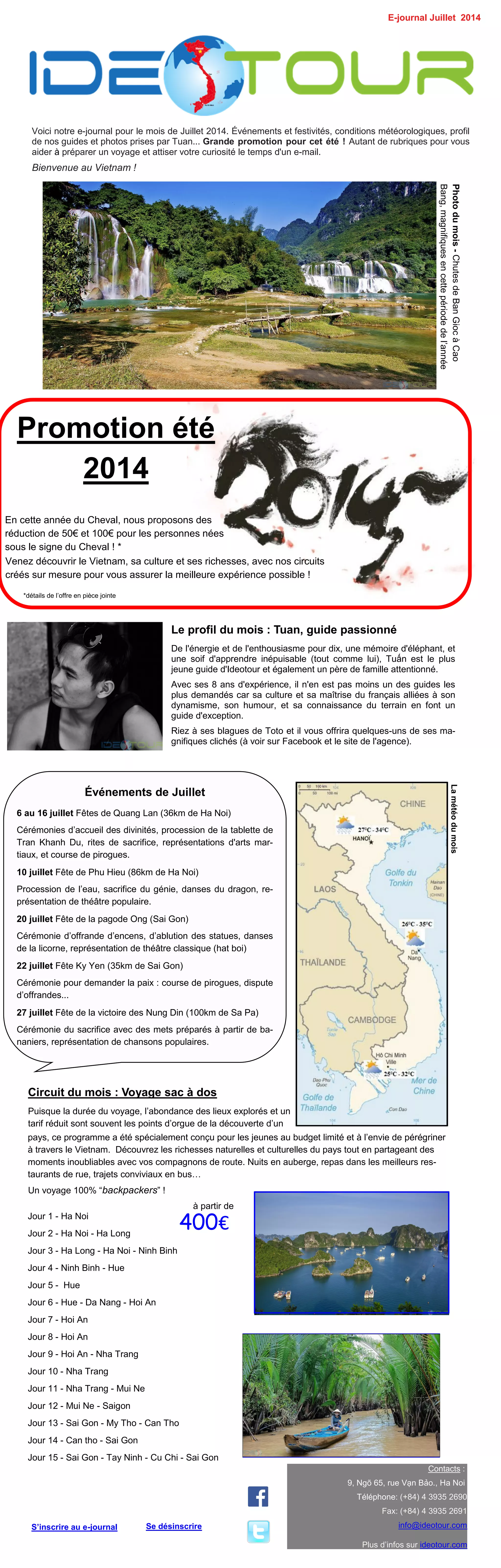 L'e-journal de juillet 2014 présente une série d'événements culturels au Vietnam et une promotion estivale. Il met en avant un voyage sac à dos de 15 jours à travers le pays, destiné aux jeunes à budget limité. Le guide du mois, Tuan, se distingue par sa passion et son expérience, promettant une expérience unique aux voyageurs.