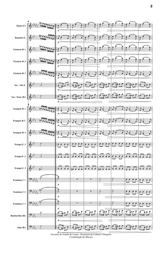 Le document semble être une série de partitions musicales comprenant des notations pour divers instruments tels que la flûte, le clarinette, le saxophone et la trompette. Il est un peu désorganisé avec des éléments répétitifs et peu d'informations contextuelles. L'ensemble semble être associés à la coordination de la musique de l'État du Ceará au Brésil.