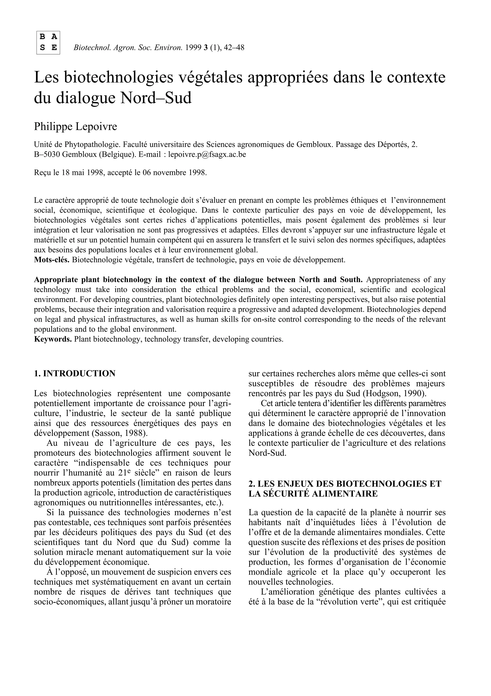 Le document aborde l'appropriation des biotechnologies végétales dans les pays en voie de développement, mettant en lumière l'importance d'une évaluation éthique et contextuelle pour leur intégration. Bien que ces biotechnologies offrent des applications prometteuses pour l'agriculture, elles nécessitent des infrastructures solides et une expertise locale pour éviter des dérives sociales et écologiques. Enfin, il souligne la nécessité d'une recherche scientifique adaptée aux réalités locales pour maximiser le transfert de technologies tout en préservant les richesses et les spécificités des milieux concernés.