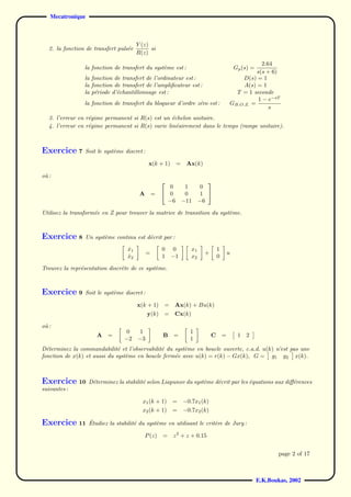 Le document contient une série d'exercices sur la mécatronique, notamment la transformée en z, les fonctions de transfert, et l'analyse de systèmes discrets et continus. Chaque exercice aborde des concepts variés, y compris la stabilisation, la commandabilité, et l'observabilité des systèmes, ainsi que des méthodes de calcul comme la décomposition en fractions simples et le théorème de la valeur finale. Les solutions aux exercices sont également exposées, illustrant les méthodes et techniques employées.