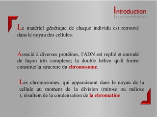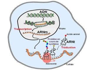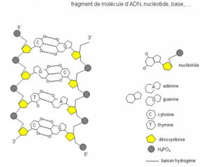 Le document traite de la structure et de la fonction de l'ADN et de l'ARN, incluant des informations sur la chromatine, les nucléotides et le code génétique. Il explique également le processus de synthèse des protéines via la transcription et la traduction, ainsi que le phénomène de réplication de l'ADN et l'impact des mutations. Enfin, il aborde brièvement le génie génétique et ses applications dans divers domaines.