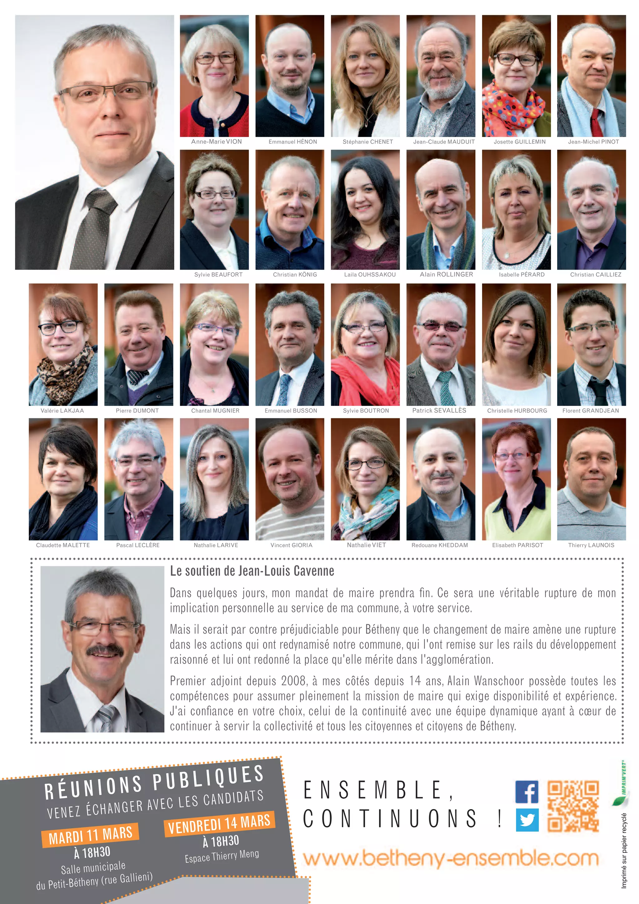 Le document présente les projets et initiatives de la municipalité de Bétheny pour la période 2014-2020, notamment des améliorations dans les services aux aînés et aux jeunes enfants, le développement d'équipements sportifs et culturels, ainsi qu'un soutien accru aux associations locales. Un engagement est pris pour maintenir un taux d'imposition stable tout en développant l'économie et l'accès aux services publics. La municipalité vise à intégrer les retours des habitants et à renforcer le dialogue pour une co-construction des projets.