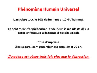 L'angoisse est un malaise rampant touchant 20% des femmes et 10% des hommes, provoquant divers symptômes physiques et mentaux. Les causes incluent des traumatismes, des pertes et des facteurs environnementaux, tandis que la gestion passe par la parole, des compétences cognitives, et des activités relaxantes. Les médicaments peuvent aider temporairement, mais un travail personnel est nécessaire pour surmonter l'angoisse et cultiver un bien-être durable.