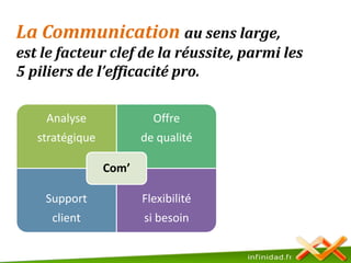 Ce document présente une méthode en cinq étapes, la méthode p.o.p.s, pour bâtir une communication professionnelle pertinente. Les étapes incluent la définition de sa personnalité professionnelle, la clarification de l'offre de services, l'identification d'un public cible, la sélection d'un support de communication approprié et l'importance de ne pas recycler les contenus. Les règles d'or soulignent la nécessité d'une communication efficace basée sur des contenus soigneusement élaborés et l'importance de faire appel à des professionnels.