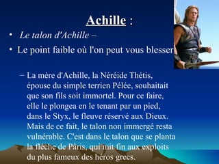 Le document présente des expressions idiomatiques dérivées de la mythologie grecque, illustrant chaque expression par des récits mythologiques comme le talon d'Achille, les yeux d'Argus, et Pandora. Chaque exemple décrit un personnage ou une situation mythologique qui a donné naissance à une métaphore ou une leçon, discutant des thèmes de la faiblesse, de la vigilance, des tragédies et des plaisirs de l'amour. Ces récits montrent comment les mythes continuent d'influencer le langage et la culture contemporains.