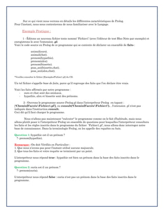 Le document présente les différentes manières d'utiliser l'interpréteur SWI-Prolog, y compris son installation, l'utilisation d'éditors de texte, et la création de fichiers de faits. Il explique également les concepts fondamentaux du langage Prolog tels que les faits, les règles, les requêtes, et la gestion des variables, ainsi que des exemples pratiques pour démontrer ces notions. De plus, il couvre des fonctionnalités avancées comme le débogage, l'utilisation des listes, et le prédicat de coupure.