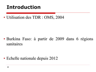 L'étude évalue l'utilisation des tests de diagnostic rapide (TDR) du paludisme dans deux régions du Burkina Faso, examinant les perceptions et pratiques des soignants ainsi que des mères d'enfants de moins de cinq ans. Les résultats montrent une appropriation générale des TDR par les soignants, mais aussi des défis tels que la disponibilité et la charge de travail accrue. Les mères, malgré des connaissances limitées, perçoivent les TDR comme bénéfiques pour le diagnostic et le traitement du paludisme.