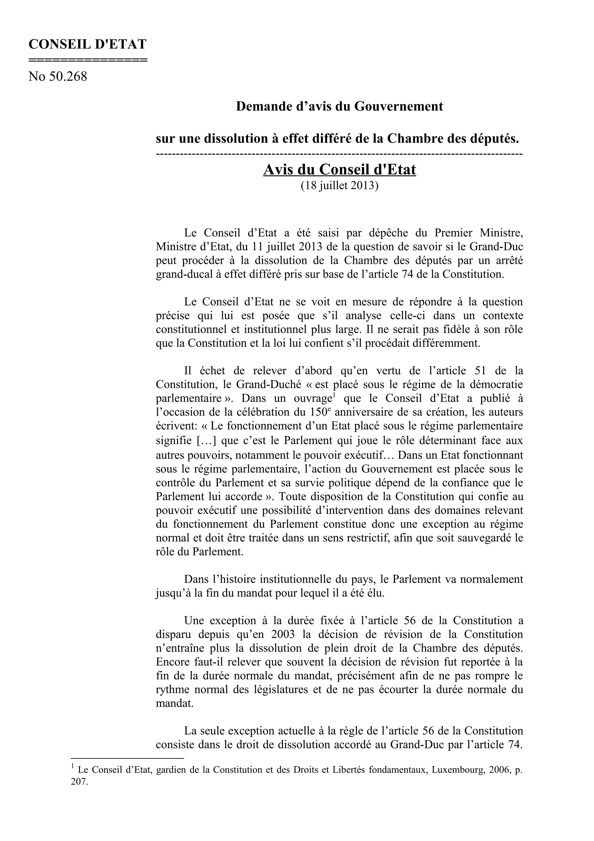 Le Conseil d'État a été saisi d'une demande d'avis sur la possibilité pour le Grand-Duc de dissoudre la Chambre des Députés par un arrêté grand-ducal à effet différé, cette dissolution étant considérée comme un instrument extraordinaire pour résoudre un conflit majeur entre la Chambre et le gouvernement. L'avis souligne l'importance de l'équilibre des pouvoirs dans un régime parlementaire et précise que la dissolution ne peut être décidée sans un conflit patent et doit répondre à un besoin fonctionnel plutôt qu'à une volonté opportuniste. En l'occurrence, les événements récents à la Chambre ne démontrent pas indiscutablement l'existence d'un conflit grave et irréversible, rendant ainsi la réponse du Conseil d'État complexe.