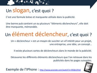 Le document traite de l'importance des slogans en publicité, soulignant qu'ils doivent être marquants et mémorables grâce à des éléments déclencheurs. Il présente différents types de déclencheurs, tels que le plaisir, l'intrigue et l'urgence, qui permettent de capter l'attention du public et d'inciter à l'action. Enfin, il est mentionné que la maîtrise de ces déclencheurs améliore la mémorisation et l'impact des messages publicitaires.