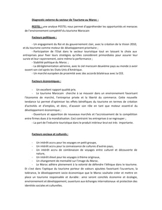 Le diagnostic externe du secteur touristique marocain révèle les opportunités et menaces via une analyse PESTEL, mettant en lumière un engagement politique fort et des facteurs économiques favorables. Le Maroc doit cependant faire face à une concurrence serrée et à des exigences croissantes de la part des consommateurs, tant en termes de diversification des offres que de durabilité. Les statistiques montrent une croissance réjouissante, notamment dans les nuitées touristiques, ce qui souligne l'importance de l'innovation et de l'amélioration continue des services.