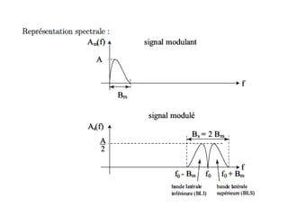 Le document explique la modulation des signaux pour la transmission d'informations, en détaillant les concepts de bande passante, de transmission en bande de base et par modulation. Il aborde différentes techniques de modulation, notamment la modulation d'amplitude et la modulation de fréquence, en mettant en lumière leurs caractéristiques et applications. Finalement, il souligne l'importance de la modulation pour optimiser la transmission et réduire les impacts des parasites.